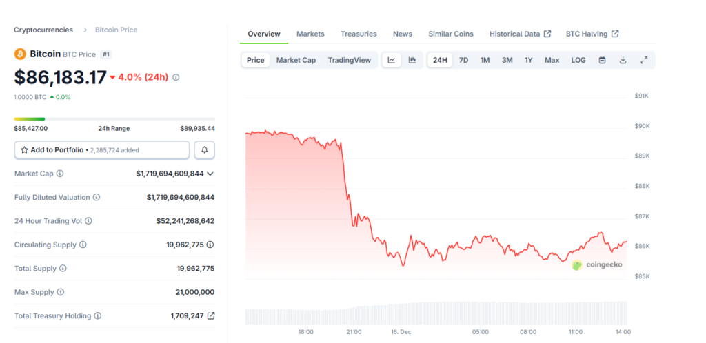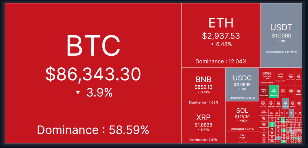 At its lowest point, Bitcoin dropped to $85,427 before staging a modest bounce to around $85,800. Even with the rebound, BTC remains down roughly 9% from last week’s high and nearly 32% below its year-to-date peak.
